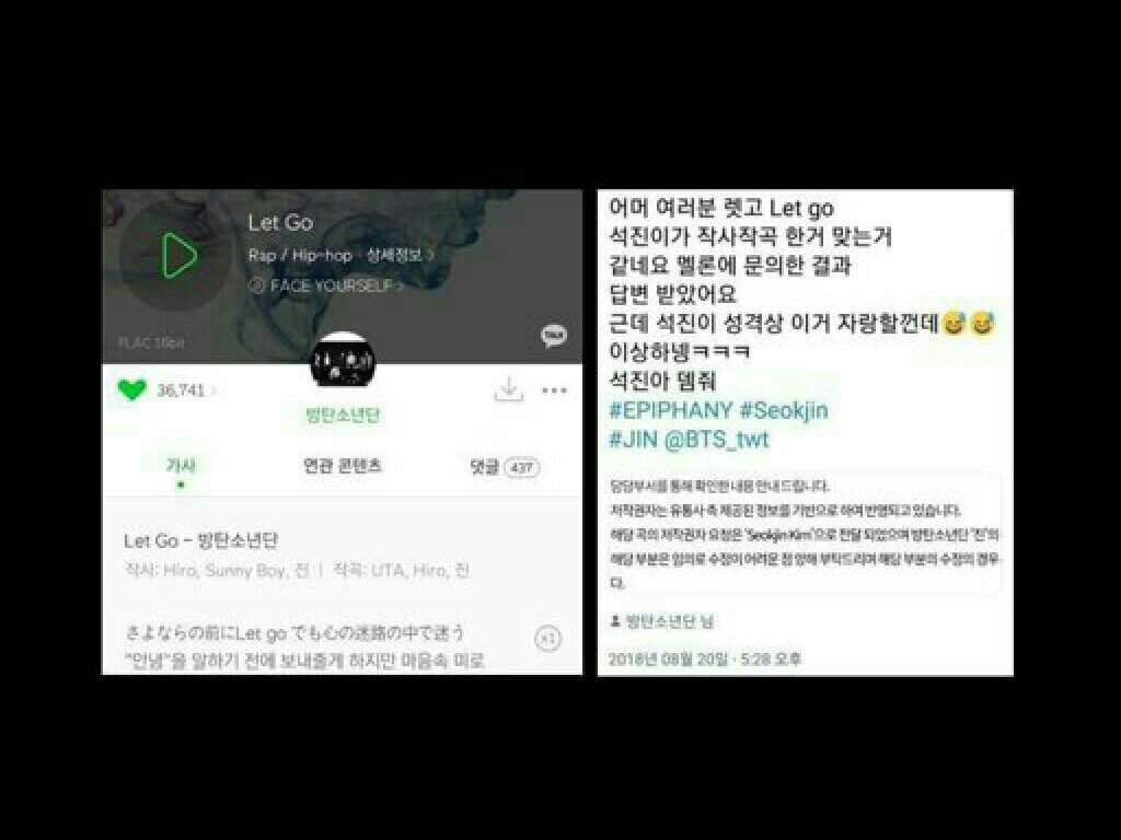 El nombre de cada canción está escrito a mano con lápiz por un miembro del grupo. BTS - Epiphany Letras y canción para escuchar - Im the one I should love in this world bichnaneun nareul sojunghan nae yeonghoneul ijeya kkaedara so I love me jom bujokhaedo neomu areumdaun geol Im the one I should love. The main music video shows BTS member Jin in a contemplative state.
